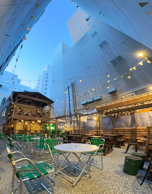 その建物に入り通路を抜けると、ビルに囲まれた不思議な空間が存在する。すすきのド真ん中でありながら、どの通りにも面していないので落ち着ける大人のビアガーデン。